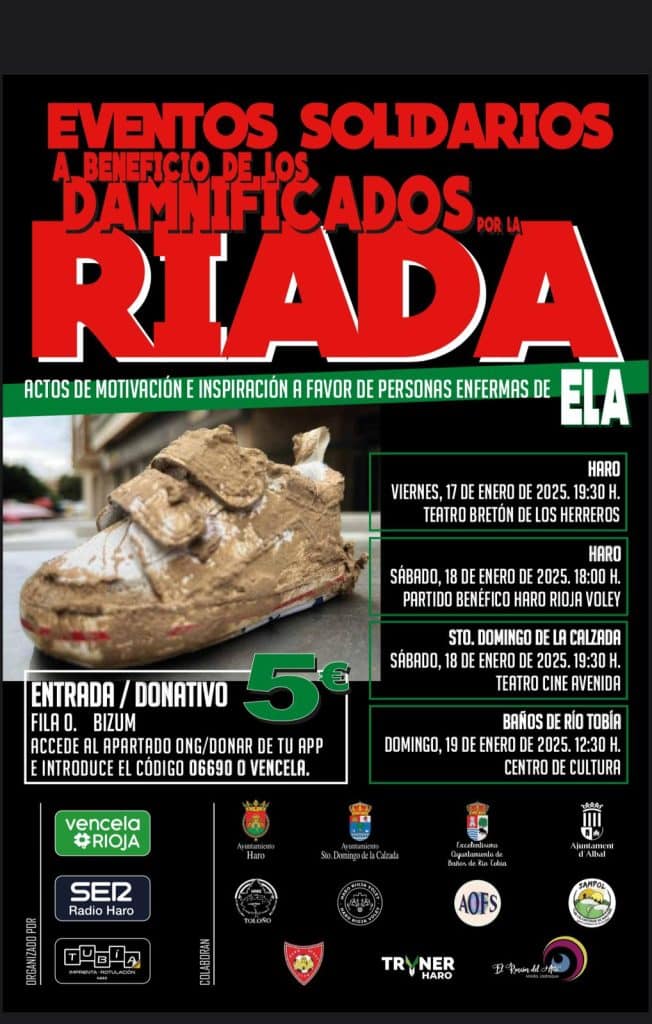 Los actos arrancarán el viernes 17 de enero a las 19:30 horas con una cita en el Teatro Bretón de los Herreros. Al día siguiente, sábado 18 de enero, a las 18:00 horas, partido benéfico del OCISA Haro Rioja Vóley. Ese mismo día, a las 19:30 horas, nueva cita en el Teatro Cine Avenida de Santo Domingo de la Calzada y al día siguiente, domingo 19 de enero, otra cita en el Centro de Cultura de Baños de Río Tobía, a las 12:30 horas.