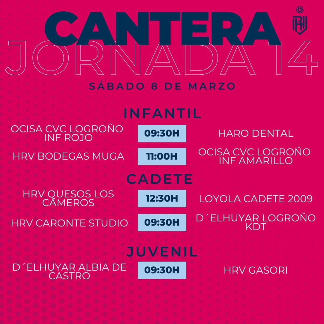 Ya en la categoría cadete, en el grupo liga, el HRV Caronte Studio recibirá este sábado (9:30 horas) en El Ferial la visita del D’Elhuyar Logroño y el HRV Queso Los Cameros hará lo propio con el Loyola 2009 en El Ferial a partir de las 12:30 horas.