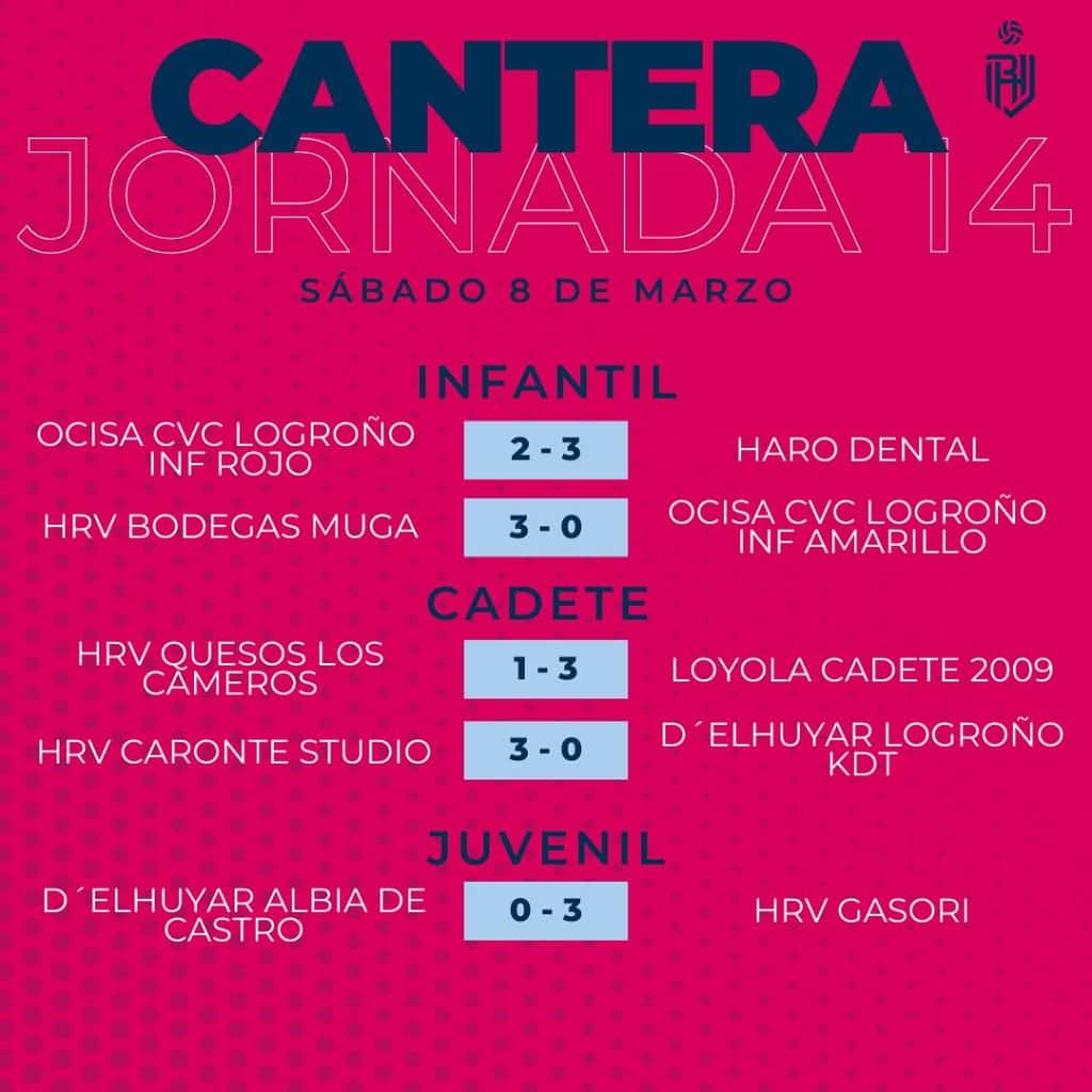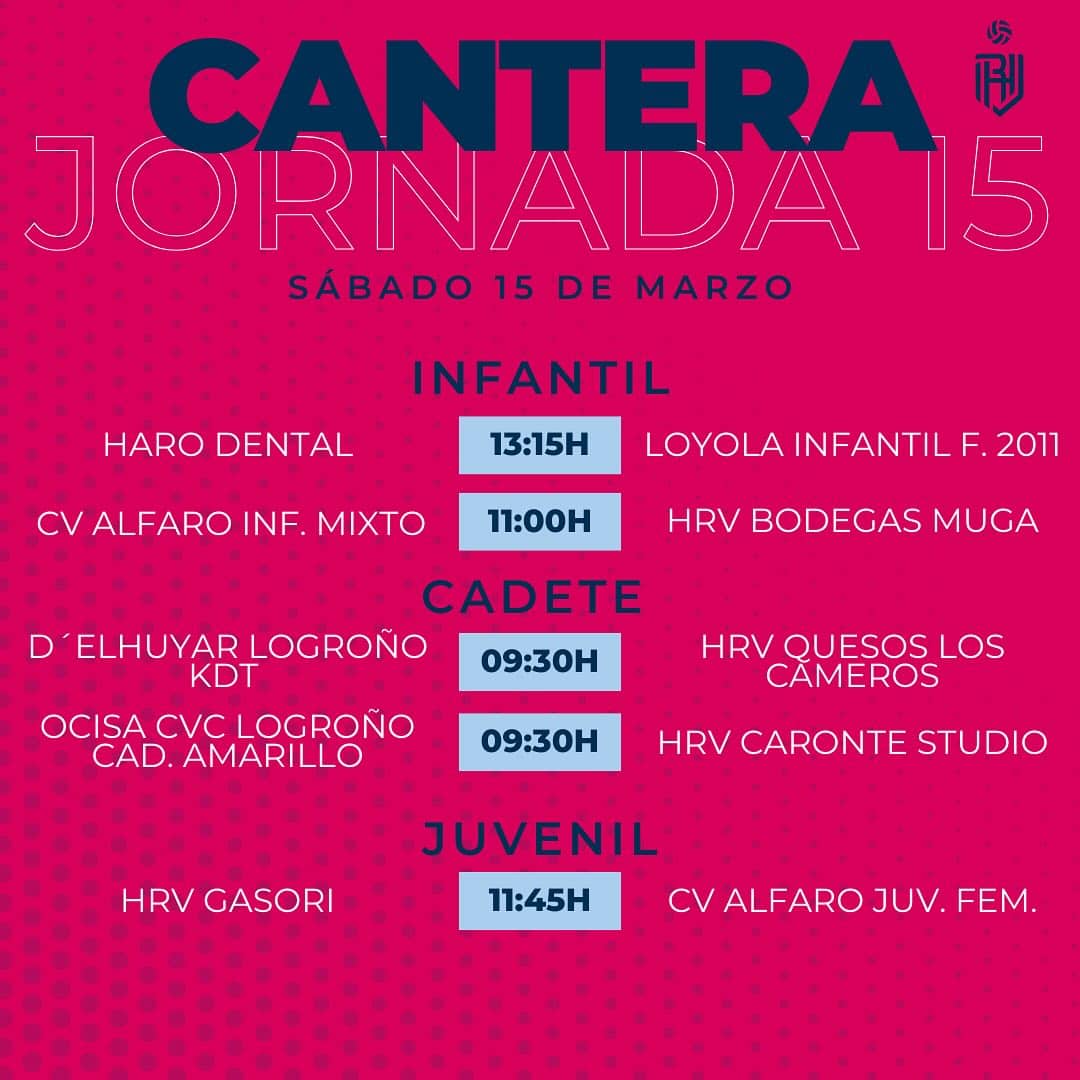 Este sábado 15 de marzo se disputa una nueva jornada de los Juegos Deportivos de La Rioja de voleibol. En la categoría cadete, el HRV Quesos Los Cameros visitará este sábado al D’Elhuyar Logroño KDT (9:30 horas) y el HRV Caronte Studio hará lo propio (9:30 horas) con el OCISA CVC Logroño Cadete Amarillo. El HRV Caronte Studio es líder del grupo con 12 puntos. En la pasada jornada, consiguió ganar por 3-0 a D’Elhuyar Logroño. Por su parte, el HRV Quesos Los Cameros es sexto con tres puntos. En la pasada jornada, cayó por 1-3 con Loyola 2009.