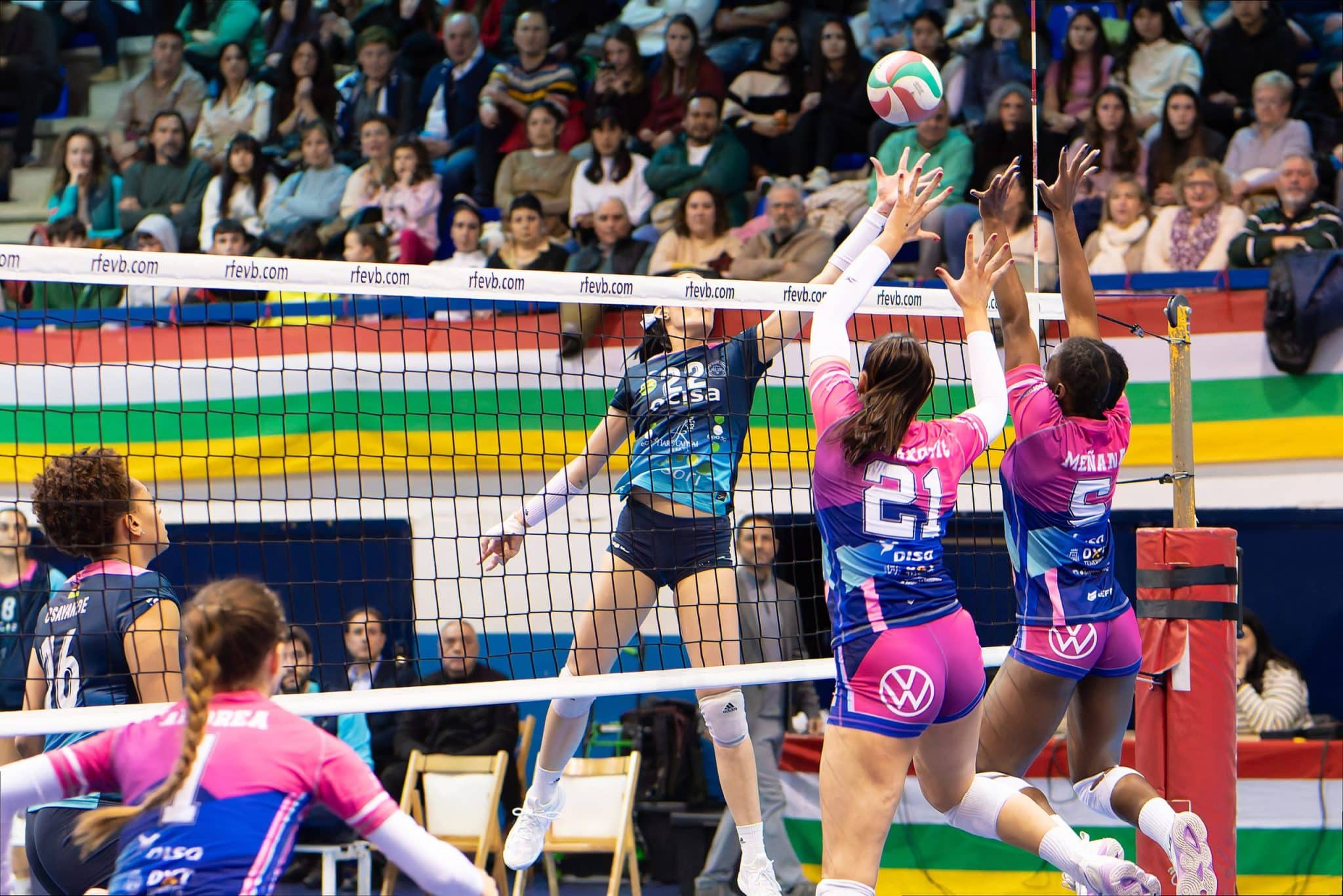 En el segundo set, Tenerife comenzó con una ligera ventaja, pero rápidamente OCISA Haro retomó el control (6-3). La diferencia de tres a cuatro puntos se mantuvo estable hasta el 21-17. Fue entonces cuando el conjunto canario reaccionó y, con un ‘block-out’ de Bely, igualó el marcador a 21. Tras otro tanto de Bely (22-22), el OCISA Haro volvió a apoyarse en Osayande para recuperar la iniciativa. Andrea puso algo de suspenso con el 24-23, pero un error suyo en el saque otorgó el segundo set a las jarreras.