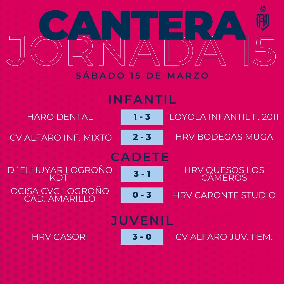 En la pasada jornada, el Haro Dental cayó por 1-3 en casa con el Loyola Infantil Femenino 2011 y el HRV Bodegas Muga venció por 2-3 al CV Alfaro Infantil Mixto fuera de casa.