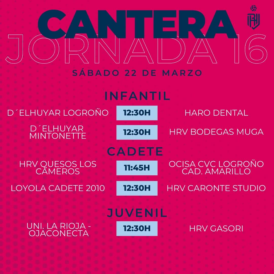 Este sábado 22 de marzo se disputa una nueva jornada de los Juegos Deportivos de La Rioja de voleibol. En la categoría infantil, los dos equipos de nuestra cantera jugarán fuera de casa. A la misma hora, 12:30 horas, el Haro Dental visitará la cancha del D’Elhuyar Logroño y el HRV Bodegas Muga hará lo propio con el D’Elhuyar Mintonette.